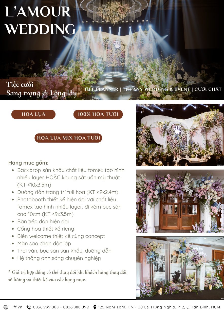 L’amour Wedding là gói trang trí được các cặp đôi yêu thích nhờ phong cách sang trọng và lộng lẫy, lý tưởng cho tiệc cưới đẳng cấp. Backdrop sân khấu được chế tác từ chất liệu fomex cao cấp với nhiều lớp hoa tươi rực rỡ, kết hợp đường dẫn hoa tươi dẫn lối, photobooth hiện đại, cổng hoa thiết kế riêng, bảng Welcome theo concept, màn sao lấp lánh, trải ván, bọc sàn sân khấu và hệ thống đèn chuyển nghiệp, tạo không gian lung linh, ấn tượng