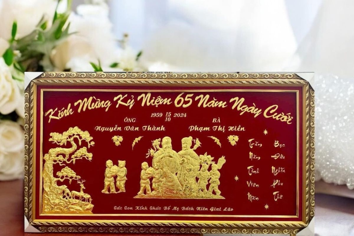- Khắc câu chúc ngắn gọn lên khánh vàng, khung ảnh, album gia đình: Việc này giúp món quà mang giá trị trưng bày và nhắc nhớ mỗi ngày. Hãy ưu tiên một lời chúc kỷ niệm ngày cưới khoảng 10 – 15 từ, dễ đọc và truyền tải thông điệp chúc bình an, hạnh phúc bền lâu. Khi quà được treo trong phòng khách hay đặt trên kệ, người nhận sẽ liên tục nhìn thấy câu chữ và được gợi lại cảm xúc trong ngày kỷ niệm.