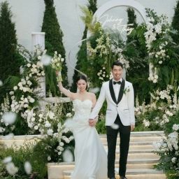 Đám cưới mang hơi thở thiên nhiên, kết hợp sắc xanh lá và trắng tinh khôi. Backdrop sân khấu được dựng từ vòm lá xanh tự nhiên, điểm xuyết đèn fairy light tạo hiệu ứng lung linh khi hoàng hôn buông xuống. Khu vực bàn tiệc phủ khăn linen trắng, lọ hoa thủy tinh tái chế cắm cành olive và lá bạch đàn. Toàn bộ hoa trang trí đều là hoa bản địa như baby, cúc trắng, lá trầu bà để tiết kiệm chi phí và thân thiện môi trường. Không khí của Greenery Wedding gợi cảm giác mát lành, lãng mạn và gần gũi như một khu vườn châu Âu giữa lòng Hà Nội.