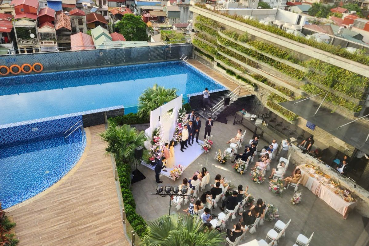 - Có bể bơi ngoài trời trên sân thượng phù hợp cho lễ cưới hoặc tiệc after-party: Trên sân thượng của Novotel Thái Hà, khu vực bể bơi ngoài trời là không gian lý tưởng cho lễ cưới ngoài trời hoặc tiệc after-party lãng mạn. Với tầm nhìn toàn cảnh thành phố và ánh đèn lung linh về đêm, không gian này mang lại cảm giác vừa sang trọng vừa phóng khoáng.