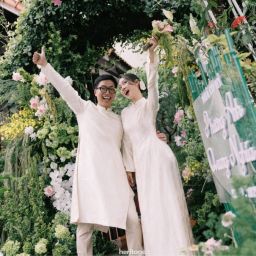 Khung kim loại kết hợp hoa và vải: Khung kim loại kết hợp các loại hoa tươi, hoa giả rực rỡ, phối thêm vải mềm sẽ giúp phông nền trở nên đa dạng và ấn tượng hơn.