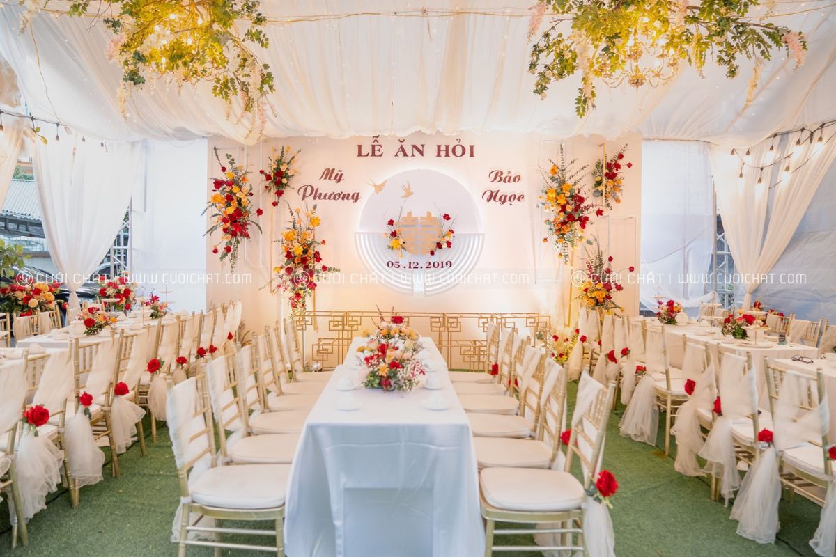- Tạo cảm giác ấm cúng, sang trọng nhưng không nặng nề: Nếu như sắc đỏ truyền thống mang đến sự rực rỡ thì phông cưới tone vàng tạo nên không khí dịu dàng nhưng vẫn quý phái, sang trọng. Tone vàng dễ hoà quyện với ánh sáng tự nhiên, tạo nên một background ấn tượng, thân mật cho nghi lễ gia tiên.