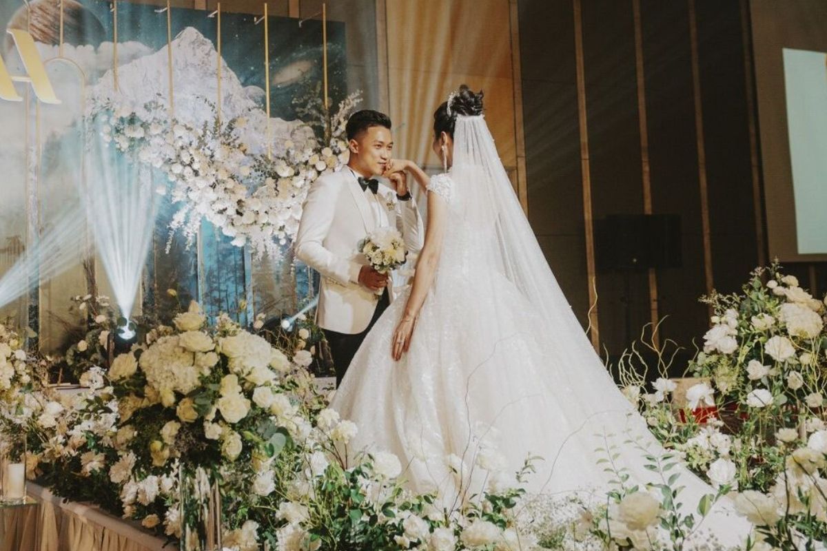 Với tông màu trắng – xanh kết hợp ánh sáng ấm áp, dự án này tái hiện không gian cưới thanh lịch, sang trọng mà vẫn gần gũi. Từng chi tiết decor được chăm chút để mang lại sự tinh tế, sang trọng nhẹ nhàng cho toàn bộ khán phòng.