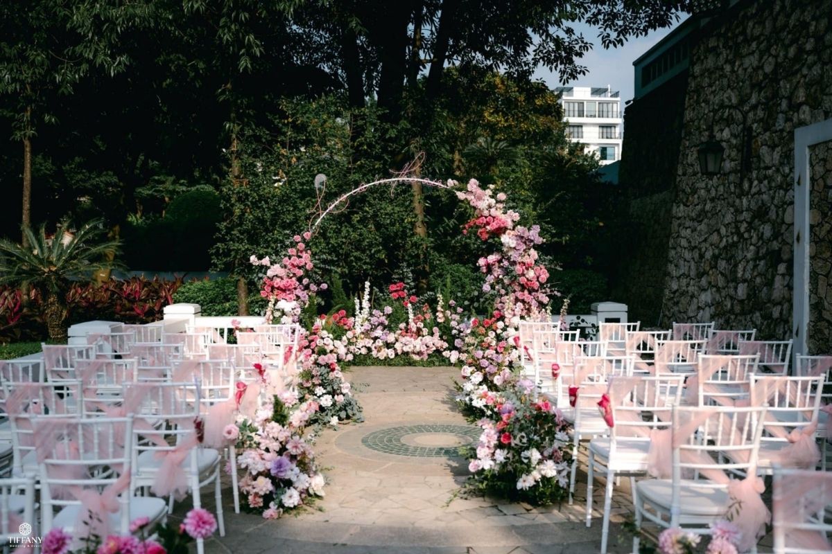 - Đây là một mẫu trang trí tiệc cưới ngoài trời mang tính cổ điển và lãng mạn tuyệt đối, tận dụng không gian sân vườn của khách sạn. Concept tập trung vào cổng hoa cưới hình vòng cung lớn được phủ dày đặc hoa tươi tông hồng từ nhạt đến đậm, tạo điểm nhấn ngọt ngào, mềm mại. Ghế Chiavari màu trắng được sử dụng, kết hợp với dải lụa hồng pastel buộc ở lưng ghế, mang lại sự đồng bộ và tinh tế cho khu vực khách mời. Lối đi lát đá được tô điểm bởi các cụm hoa đối xứng, tạo nên một không gian nghi lễ trang nhã, đúng chất tiệc cưới ngoài trời tại khách sạn cao cấp.