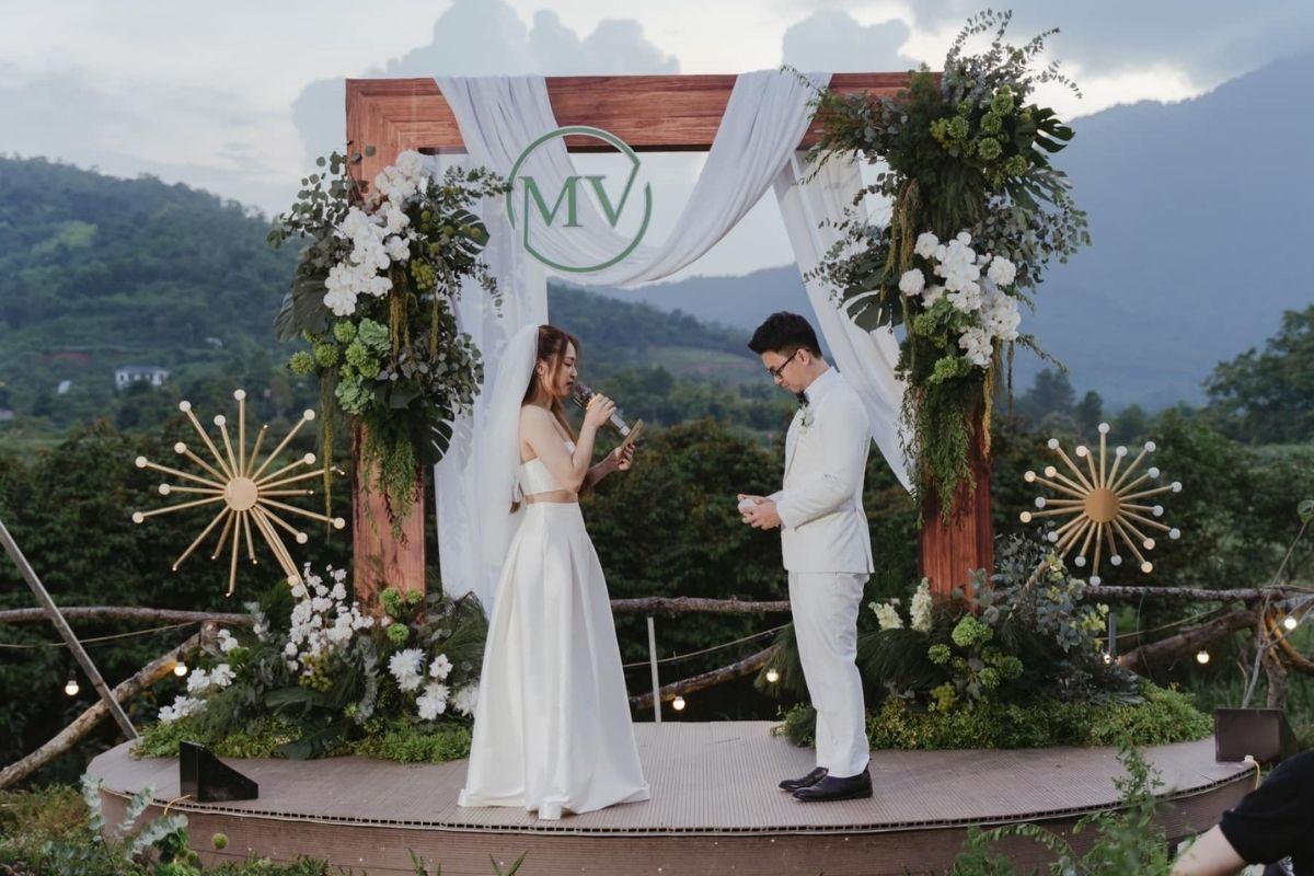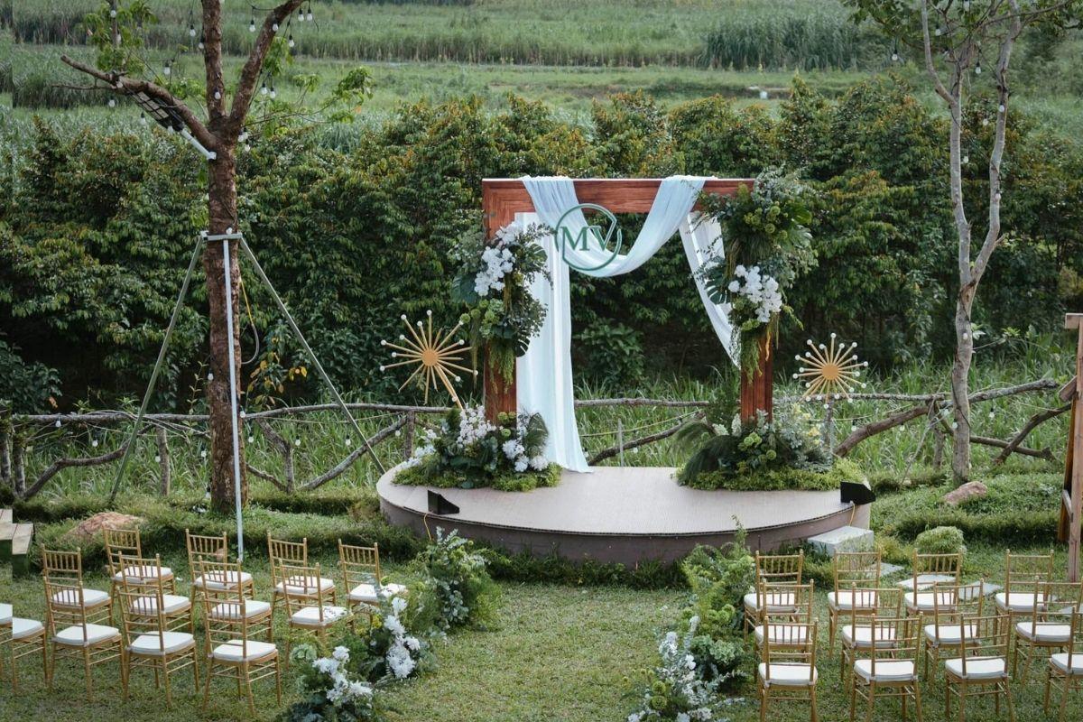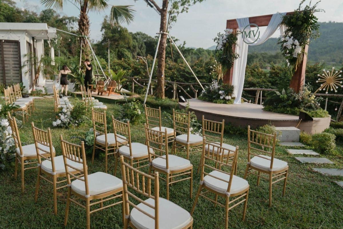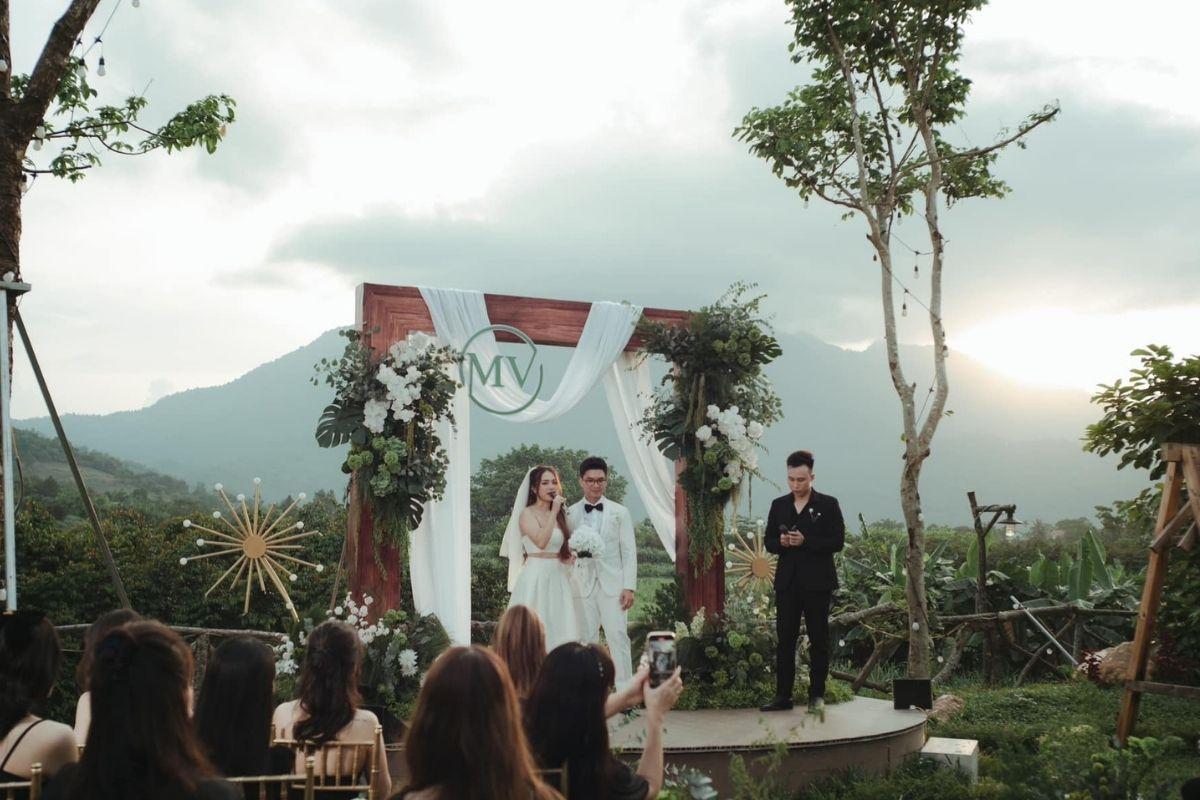 - Khung cảnh thiên nhiên hoang sơ: Sân vườn được bao quanh bởi cây xanh nhẹ nhàng, cảnh quan đồi núi và không gian mở giúp tái tạo cảm giác hòa mình với thiên nhiên rất phù hợp cho lễ cưới theo phong cách rustic luxury hoặc boho nhẹ nhàng.