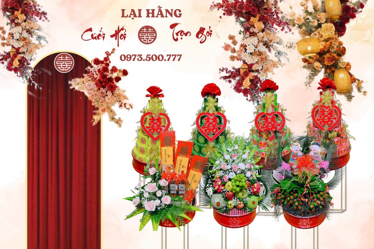 Dịch vụ nổi bật: Cung cấp đầy đủ các gói tráp ăn hỏi truyền thống (5, 7, 9, 11 lễ), đặc biệt nổi bật với các mẫu Tráp Rồng Phượng kết hoa quả lớn, lộng lẫy. Đồng thời, đơn vị còn cung cấp dịch vụ cưới hỏi trọn gói bao gồm thuê xe cưới, hoa cưới, phông rạp.