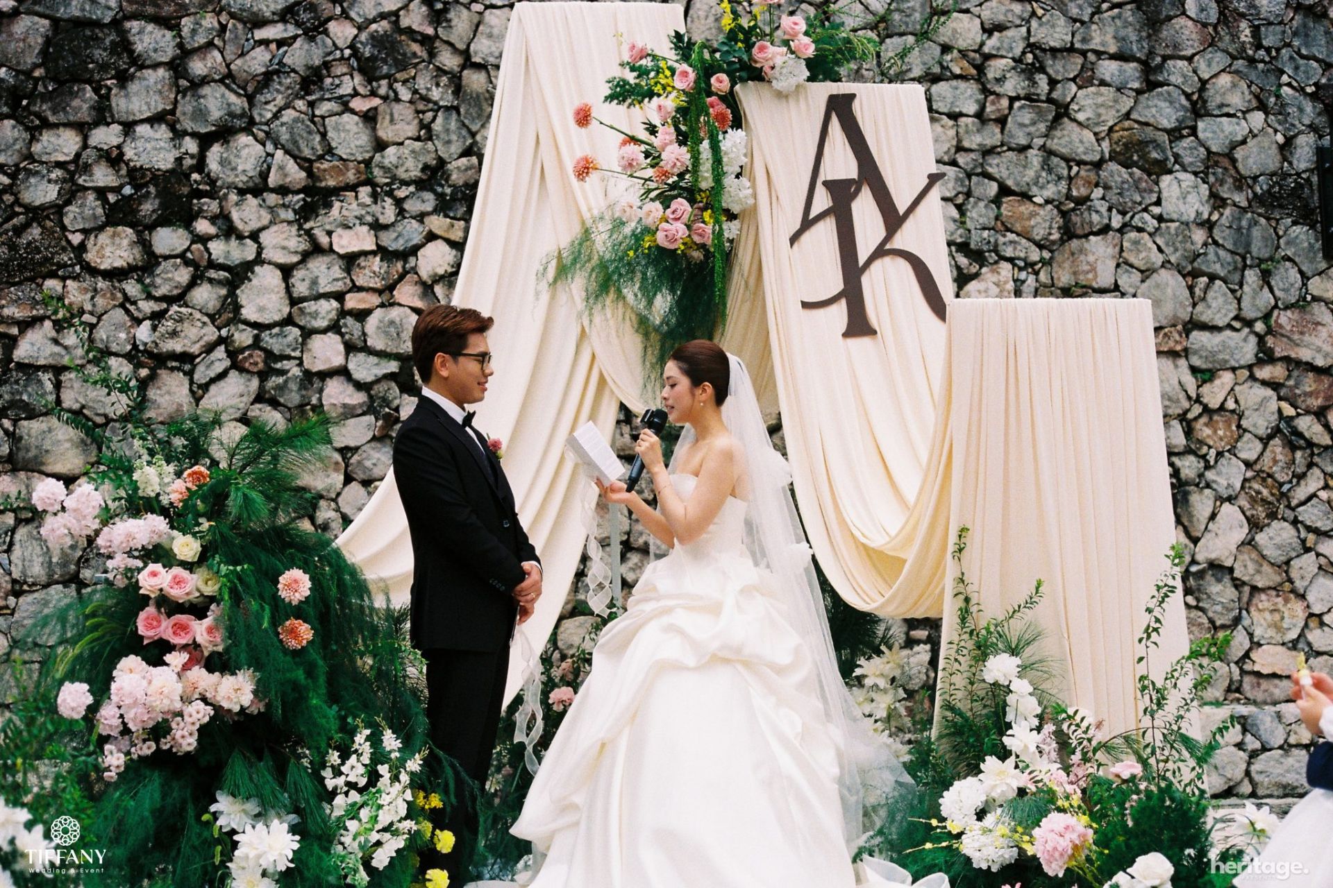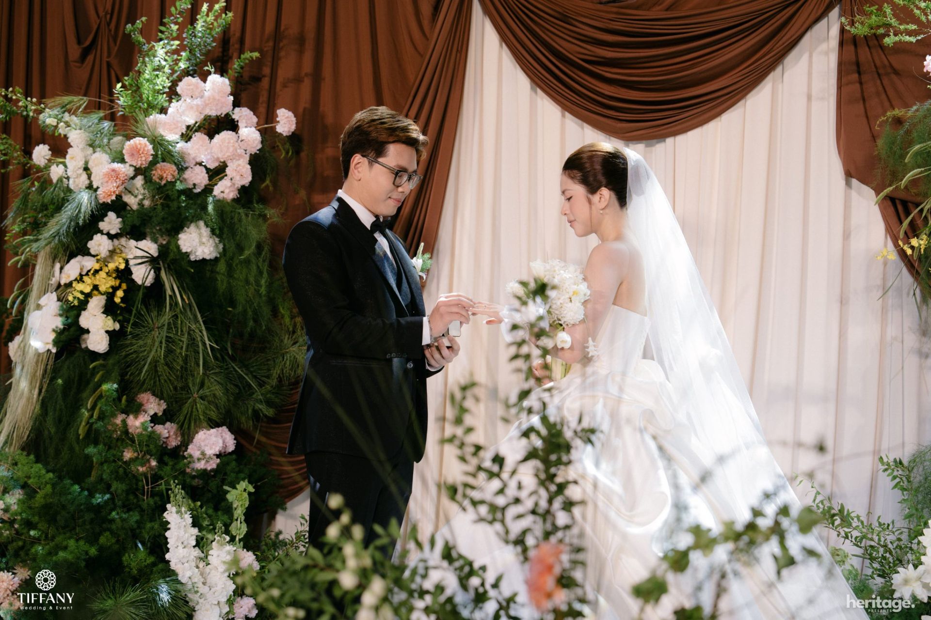 Lễ cưới của Khải và Châu Anh được TIFF điều phối mở đầu bằng một lễ vow ngoài trời tại Sheraton Hanoi, nơi cảm xúc được dẫn dắt một cách chậm rãi và tinh tế. Trong không gian cây xanh ngập tràn ánh sáng tự nhiên dịu nhẹ, TIFF lựa chọn bố cục tối giản để tạo nên một khoảng riêng đủ yên bình, nơi cặp đôi có thể thực sự hiện diện bên nhau và trao gửi những lời hứa chân thành nhất.