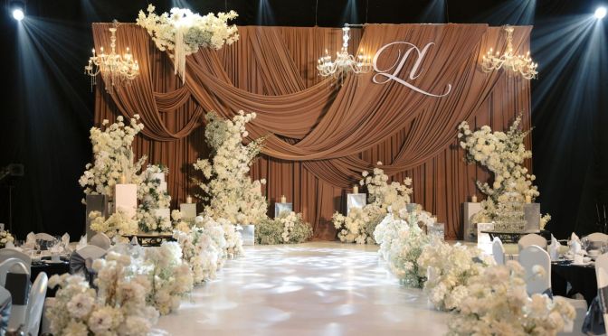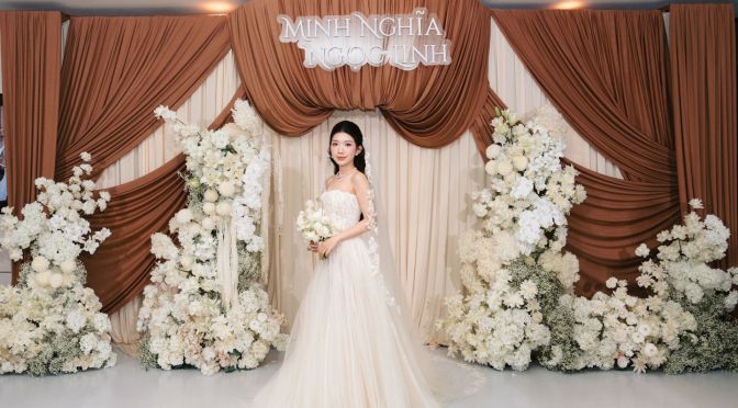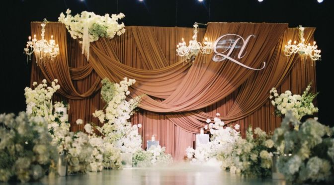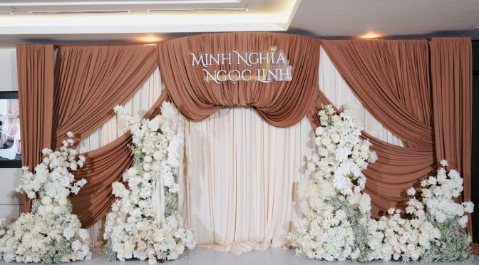 Sự mềm mại của vải được kết hợp hài hòa với những cụm hoa trắng tinh khôi và bố cục đối xứng chặt chẽ của sân khấu. Sự tương phản giữa nền Mocha và hoa trắng đã giúp concept tăng thêm chiều sâu về mặt thị giác một cách hiệu quả.