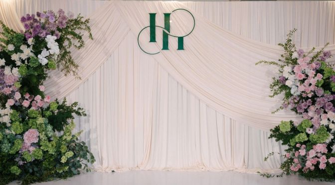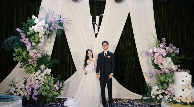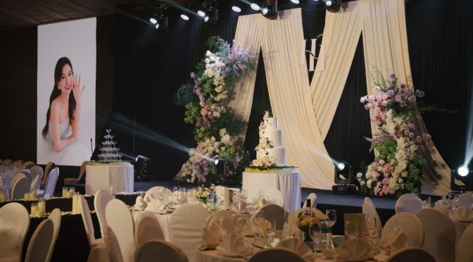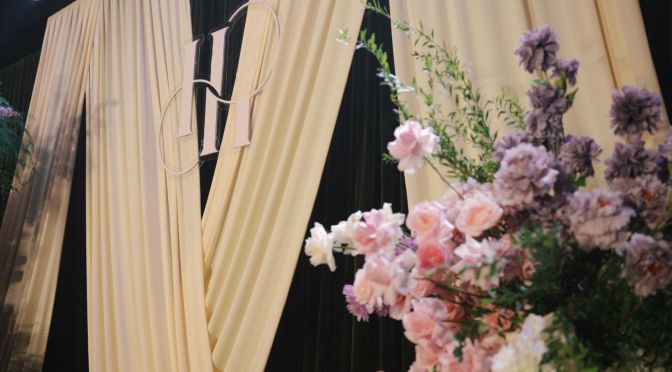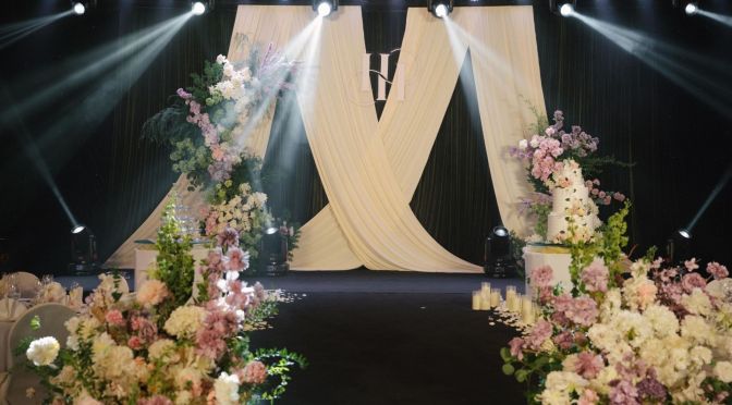 Bên dưới, từng tầng hoa được layering khéo léo, nơi sắc xanh – trắng – tím nhạt đan xen. Sự kết hợp hài hòa về kết cấu, sắc độ và chiều cao này mang đến một hiệu ứng thị giác dịu dàng nhưng đầy ấn tượng, dẫn dắt ánh nhìn và mọi cảm xúc hướng trọn vẹn về sân khấu – nơi câu chuyện tình yêu được kể.