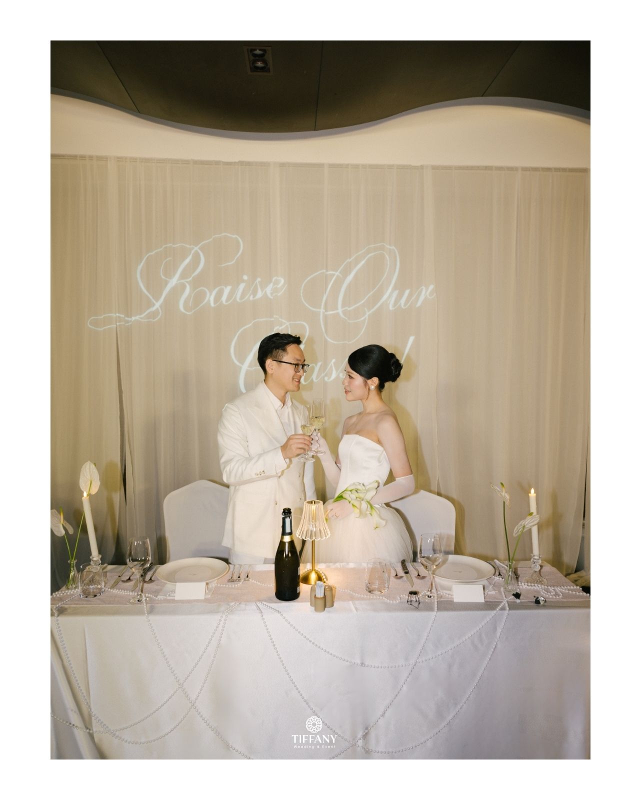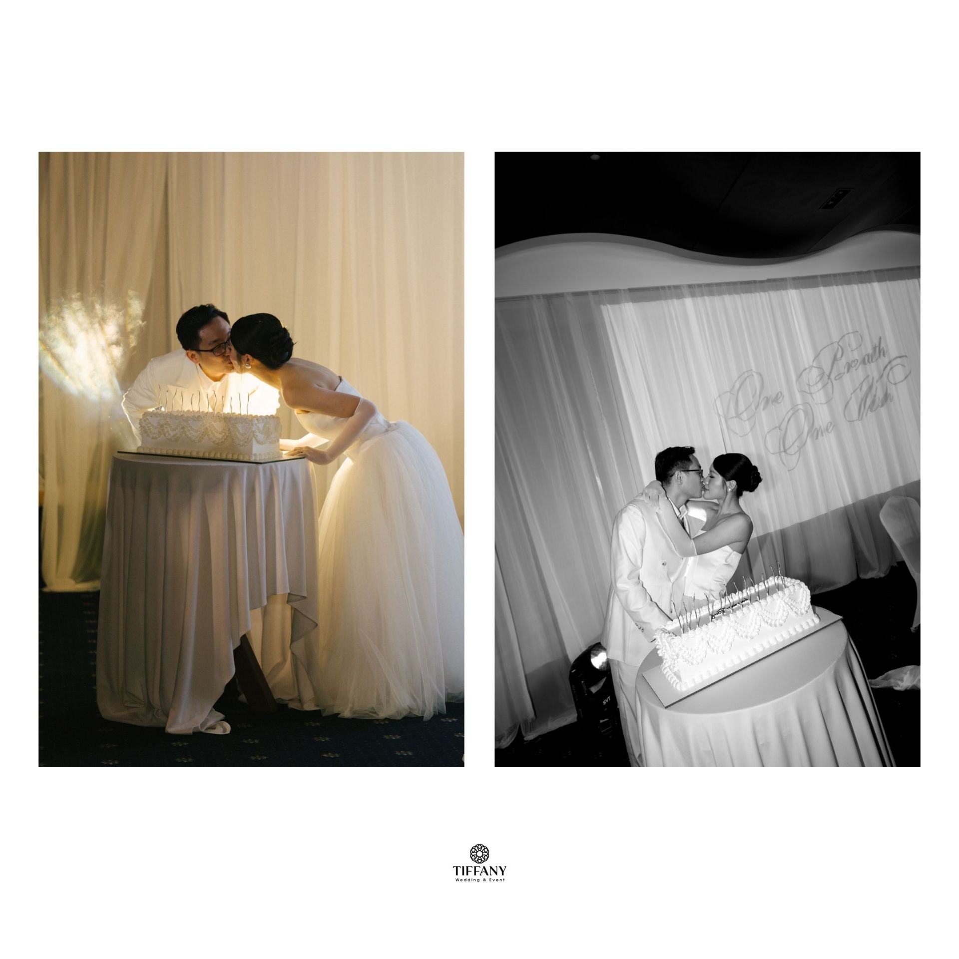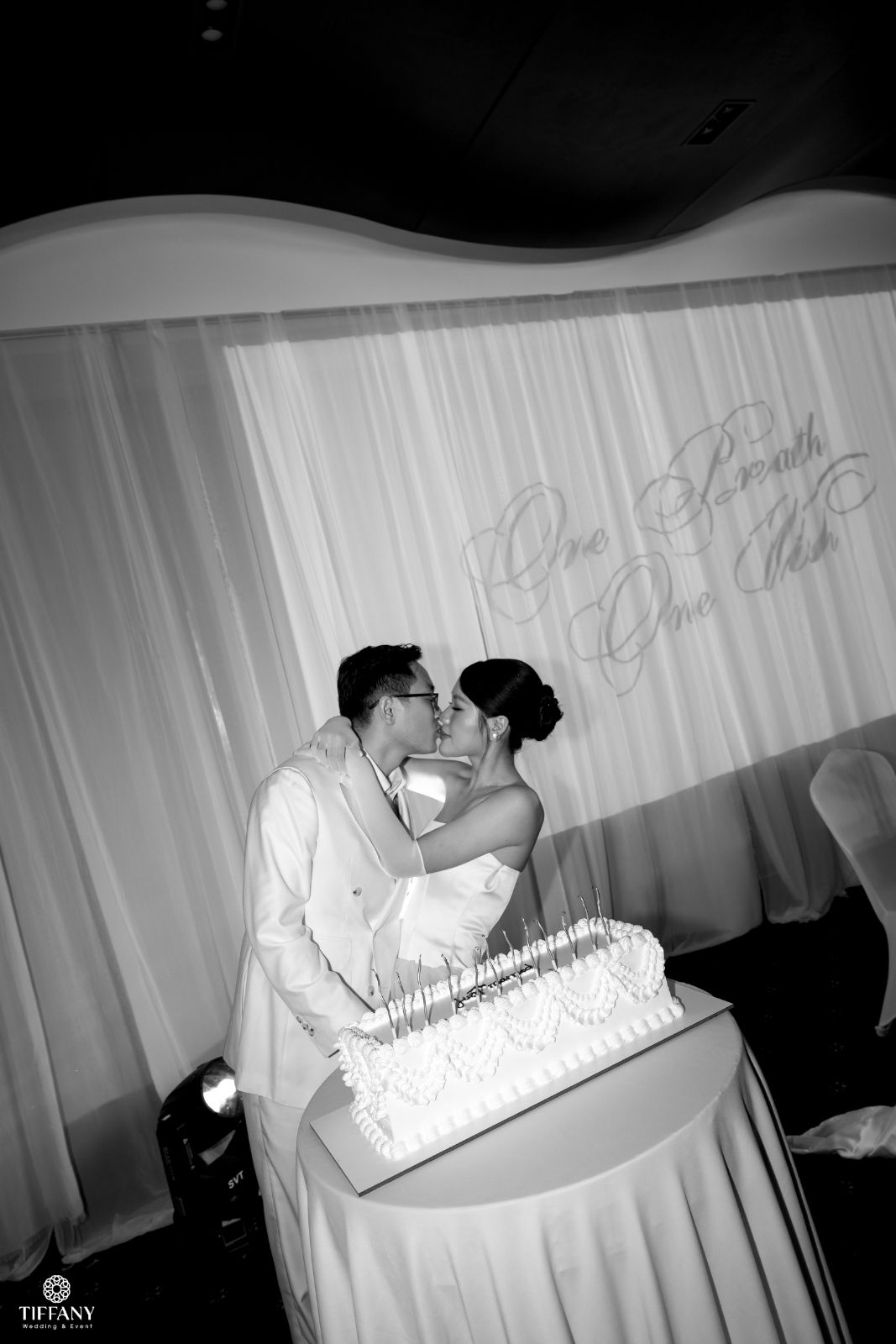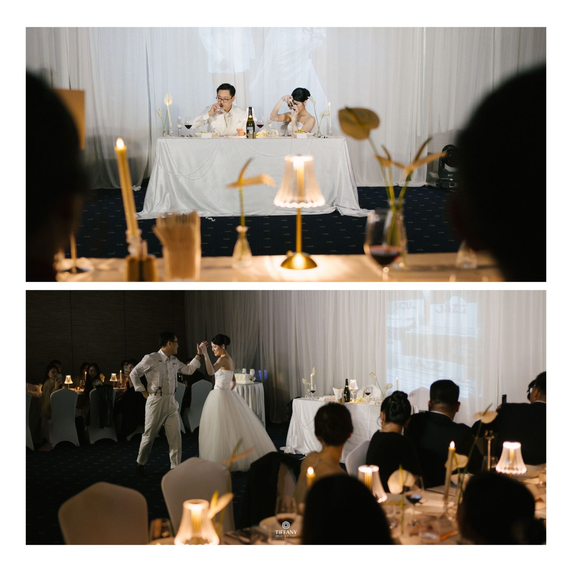 Sắc trắng ngà được chọn làm gam màu chủ đạo để giữ lại cảm giác tinh khôi và thanh lịch, ánh sáng ấm được xử lý vừa đủ để ôm trọn từng bàn tiệc. “Projector on drapes” được sử dụng để sân khấu chính trở thành phông nền hoàn hảo tôn vinh từng khoảnh khắc trọng đại của Sơn & Vy. Không gian tối giản nhưng giàu chiều sâu thị giác, tập trung hoàn toàn vào sự kết nối giữa cô dâu chú rể và khách mời.
