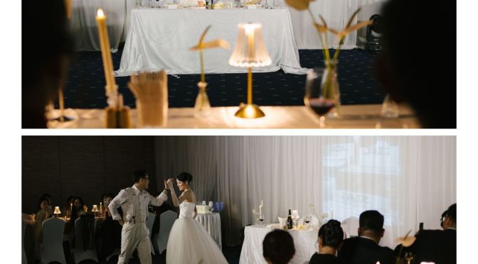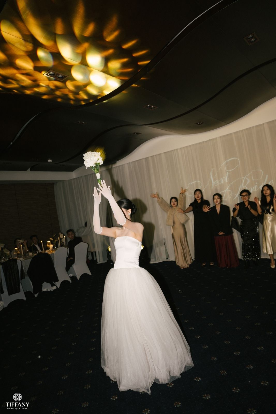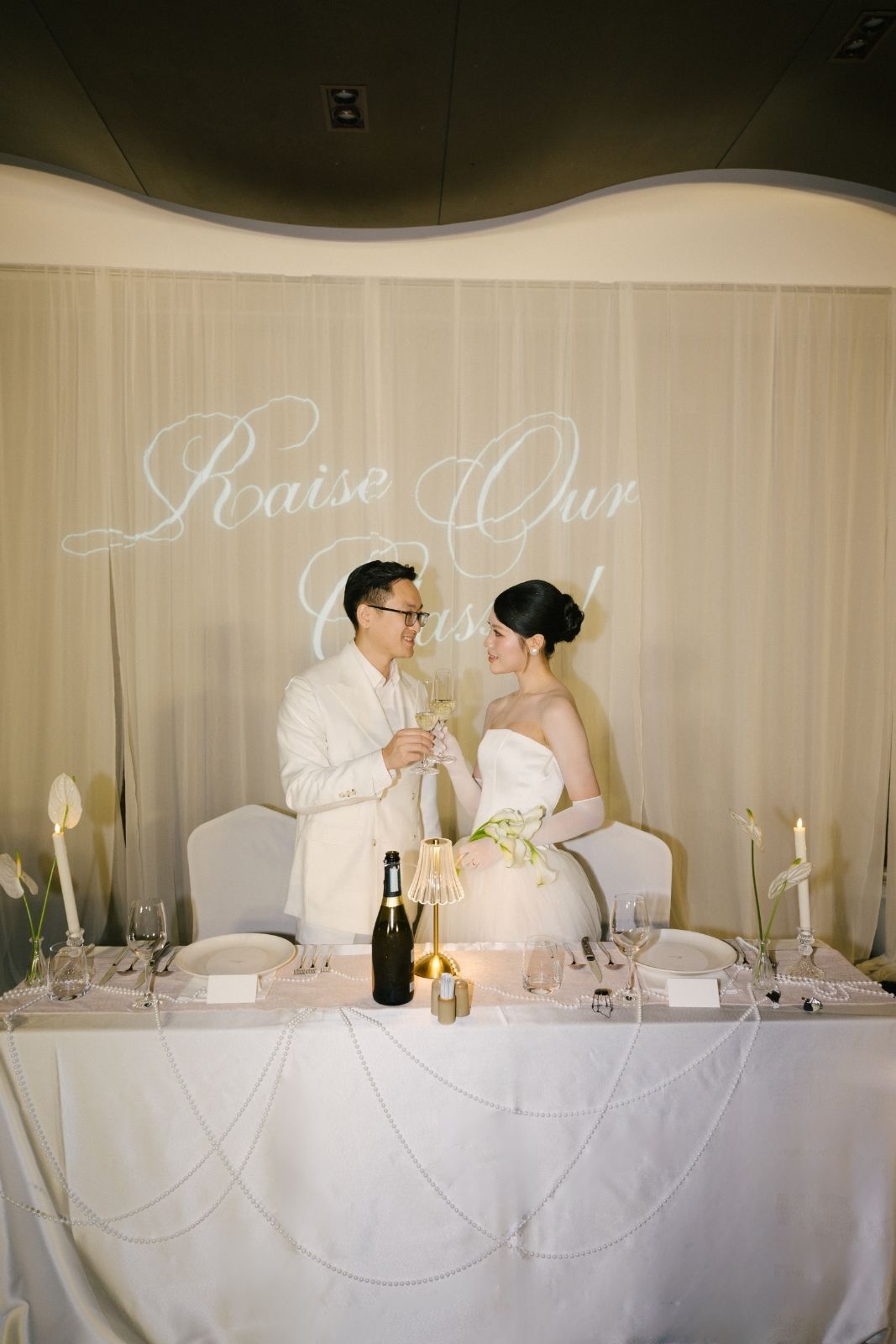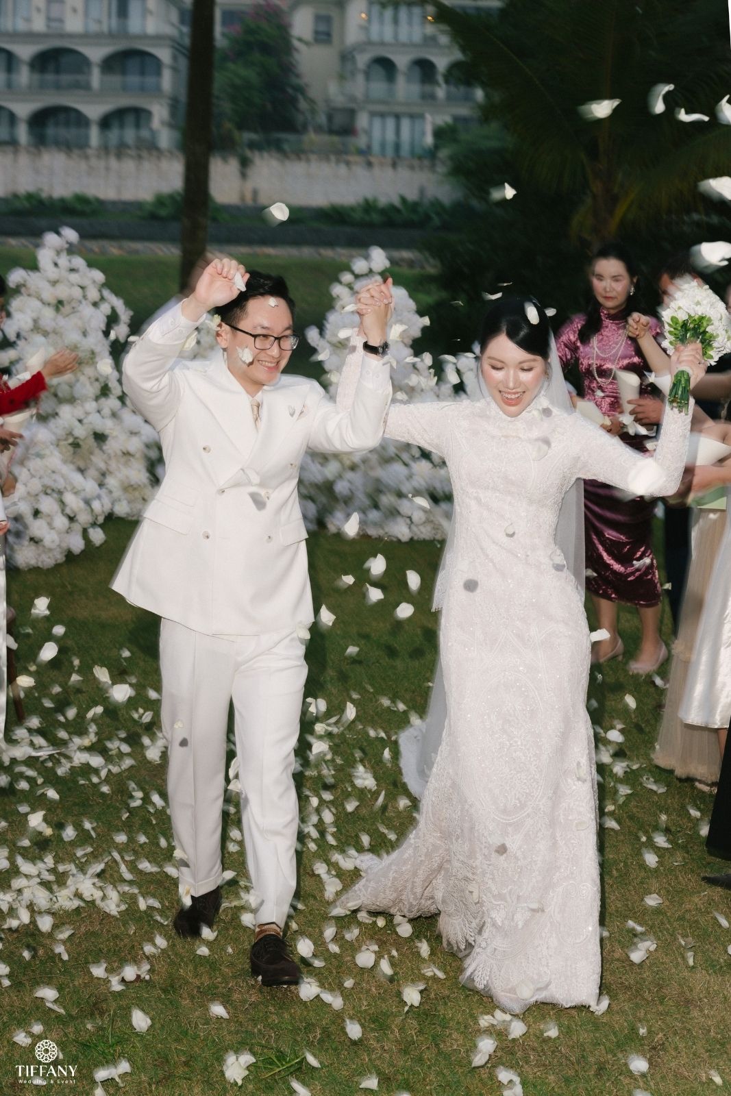 Sắc trắng ngà được chọn làm gam màu chủ đạo để giữ lại cảm giác tinh khôi và thanh lịch, ánh sáng ấm được xử lý vừa đủ để ôm trọn từng bàn tiệc. “Projector on drapes” được sử dụng để sân khấu chính trở thành phông nền hoàn hảo tôn vinh từng khoảnh khắc trọng đại của Sơn & Vy. Không gian tối giản nhưng giàu chiều sâu thị giác, tập trung hoàn toàn vào sự kết nối giữa cô dâu chú rể và khách mời.