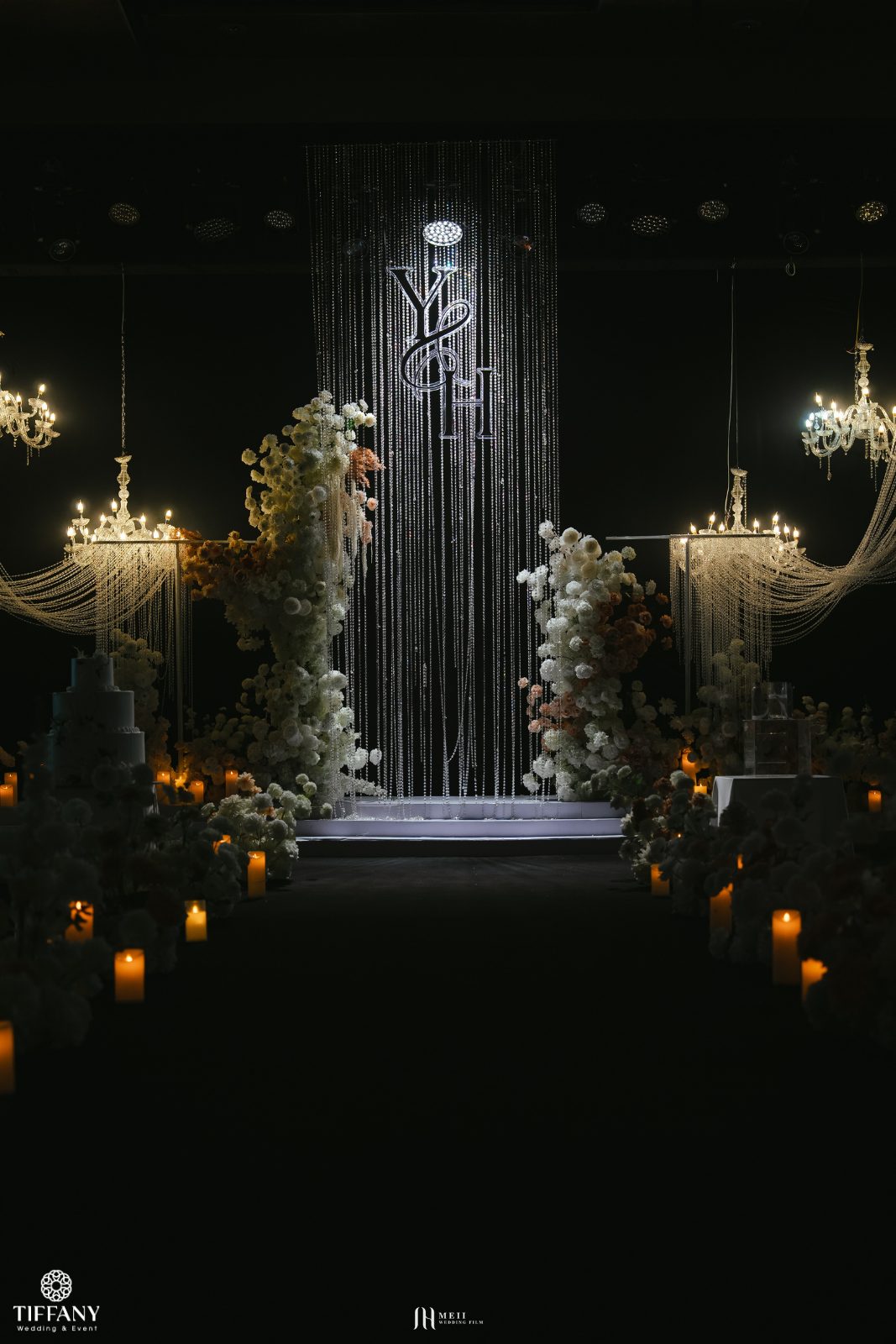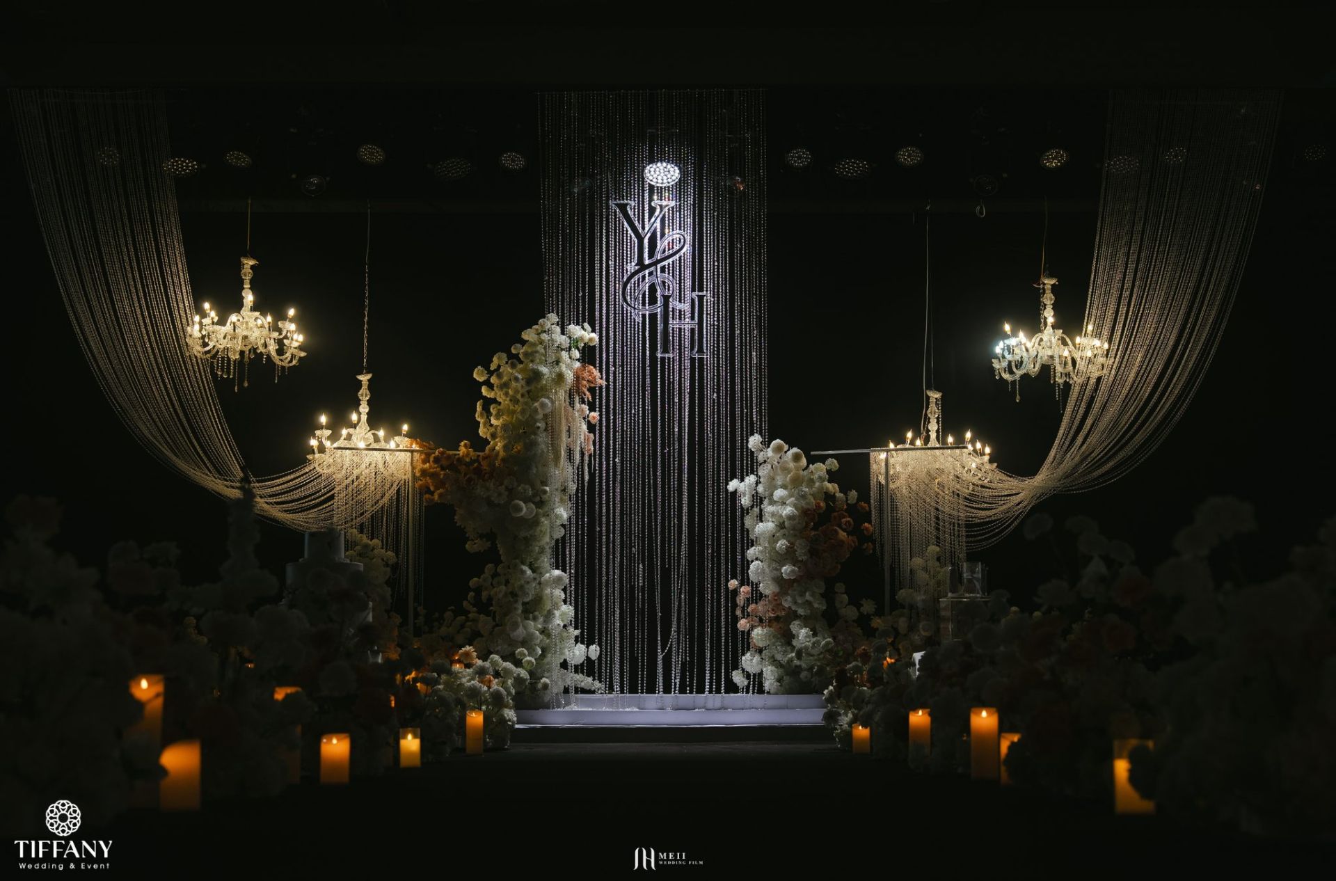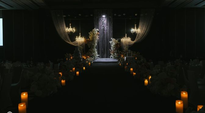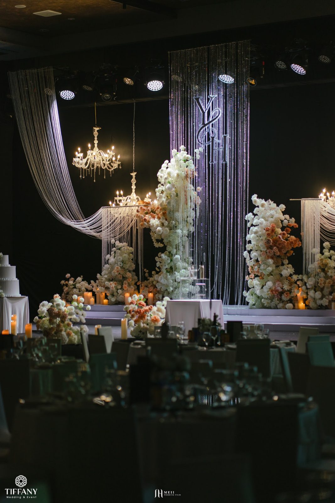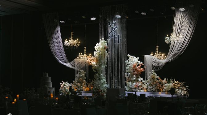 Thay vì những sắc hoa rực rỡ, không gian tiệc cưới được bao phủ bởi tone màu Be – Nâu – Trắng đầy tinh tế và sang trọng. Sắc trắng tinh khôi của hoa hòa quyện cùng sắc Be trung tính và tone Nâu trầm ấm, tạo nên một chiều sâu cảm xúc cực kỳ vững chãi, giống như tính cách chỉnh chu và điềm đạm của Yogesh. Trong không gian sâu thẳm của sảnh tiệc, những dải pha lê lấp lánh & ánh nến vàng đã biến toàn bộ sân khấu thành một “bầu trời” thu nhỏ lộng lẫy nhưng vẫn vô cùng gần gũi. Sự kết hợp màu sắc này không chỉ mang lại vẻ đẹp bền bỉ với thời gian mà còn hiện thực hóa mong muốn của cặp đôi về một buổi lễ ấm áp, nơi mọi khách mời đều cảm nhận được sự chỉn chu và niềm vui chân thành.